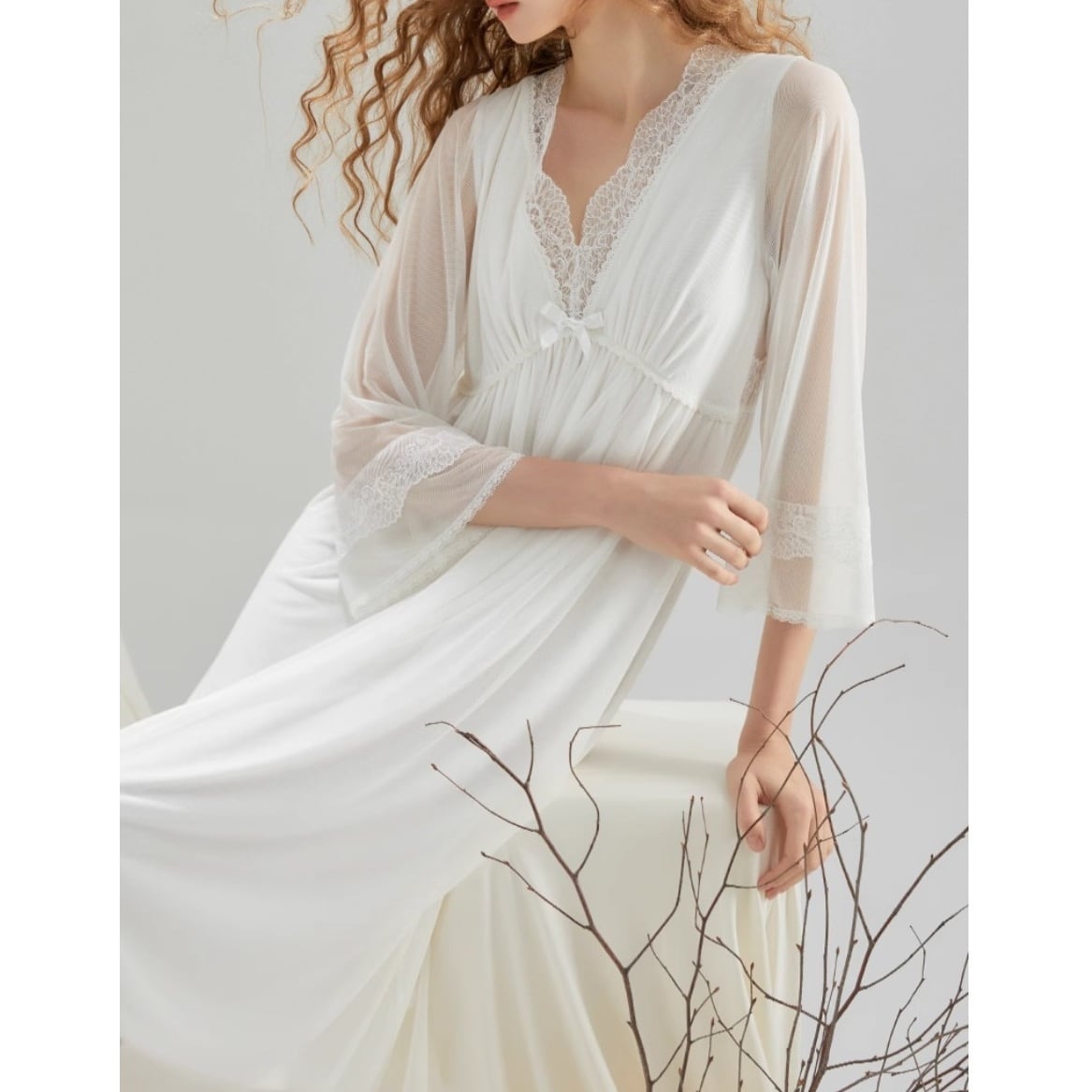 さらっと軽やかなシースルー素材と、胸元の繊細なレースがポイントのリラックスウェア。