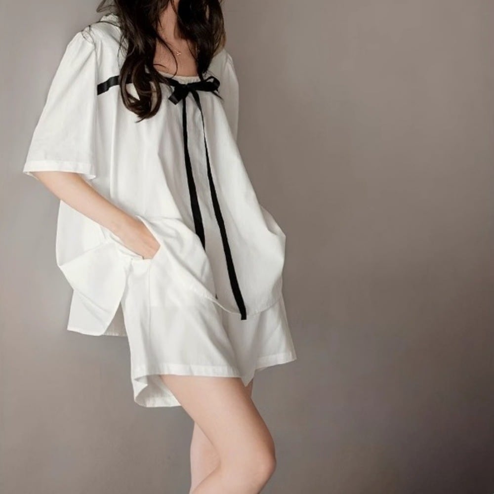【M-XL】two-tone ribbon decoration pajamas p1486