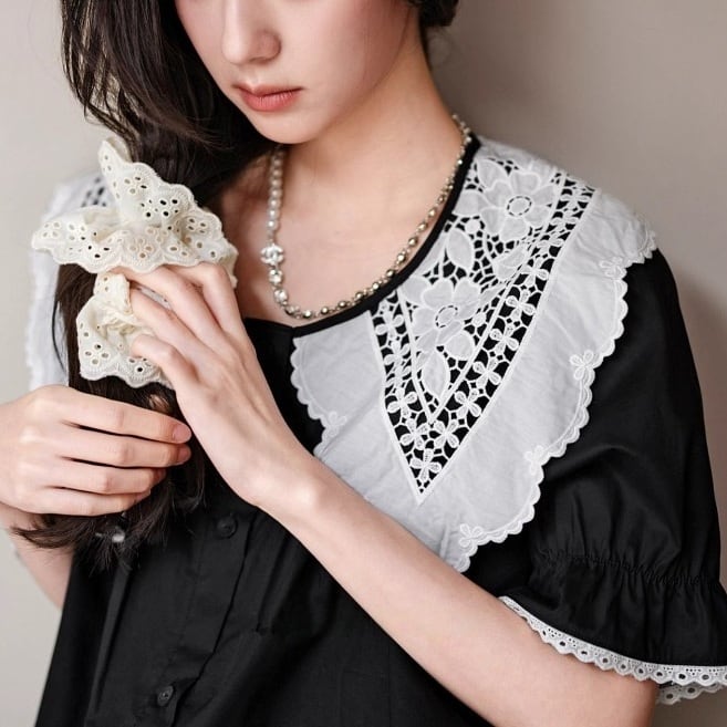 愛らしいドールカラーが顔まわりを優しく彩り、花柄レースのディテールが上品な華やかさをプラス。