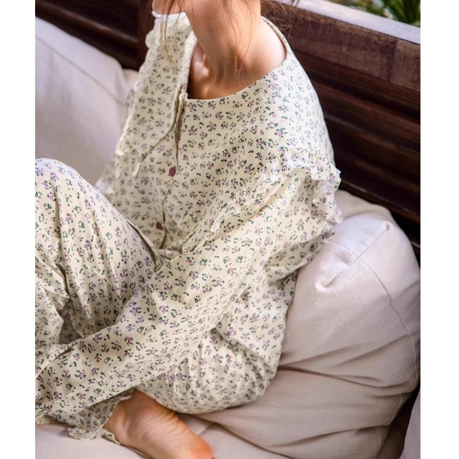 フリルカラーが可憐に揺れる、小花柄カーディガンパジャマSET。