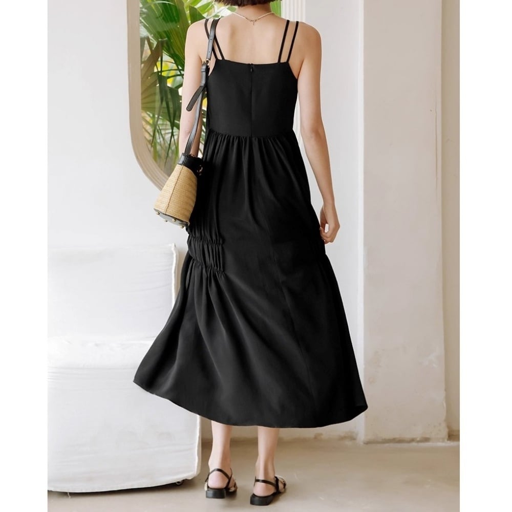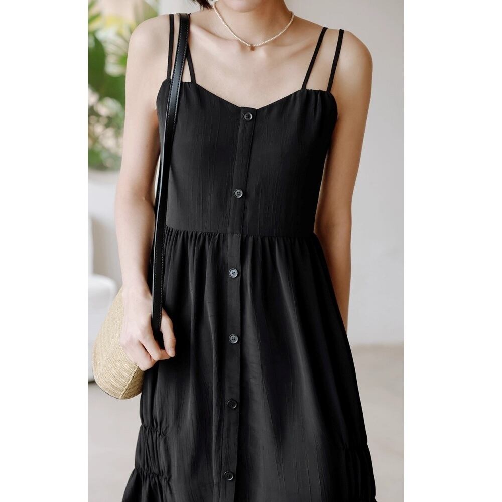 華奢なダブルストラップとフロントのボタンデザインが、大人の抜け感をプラス。