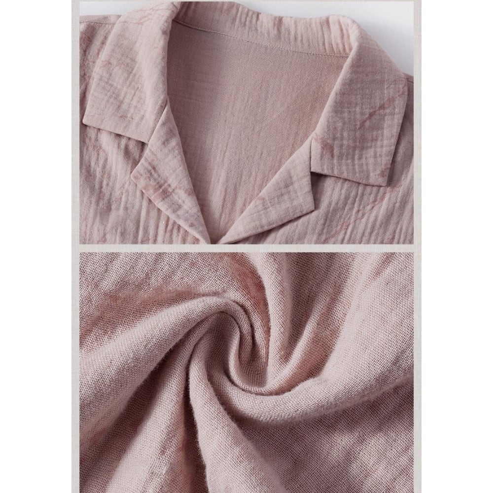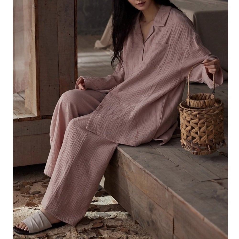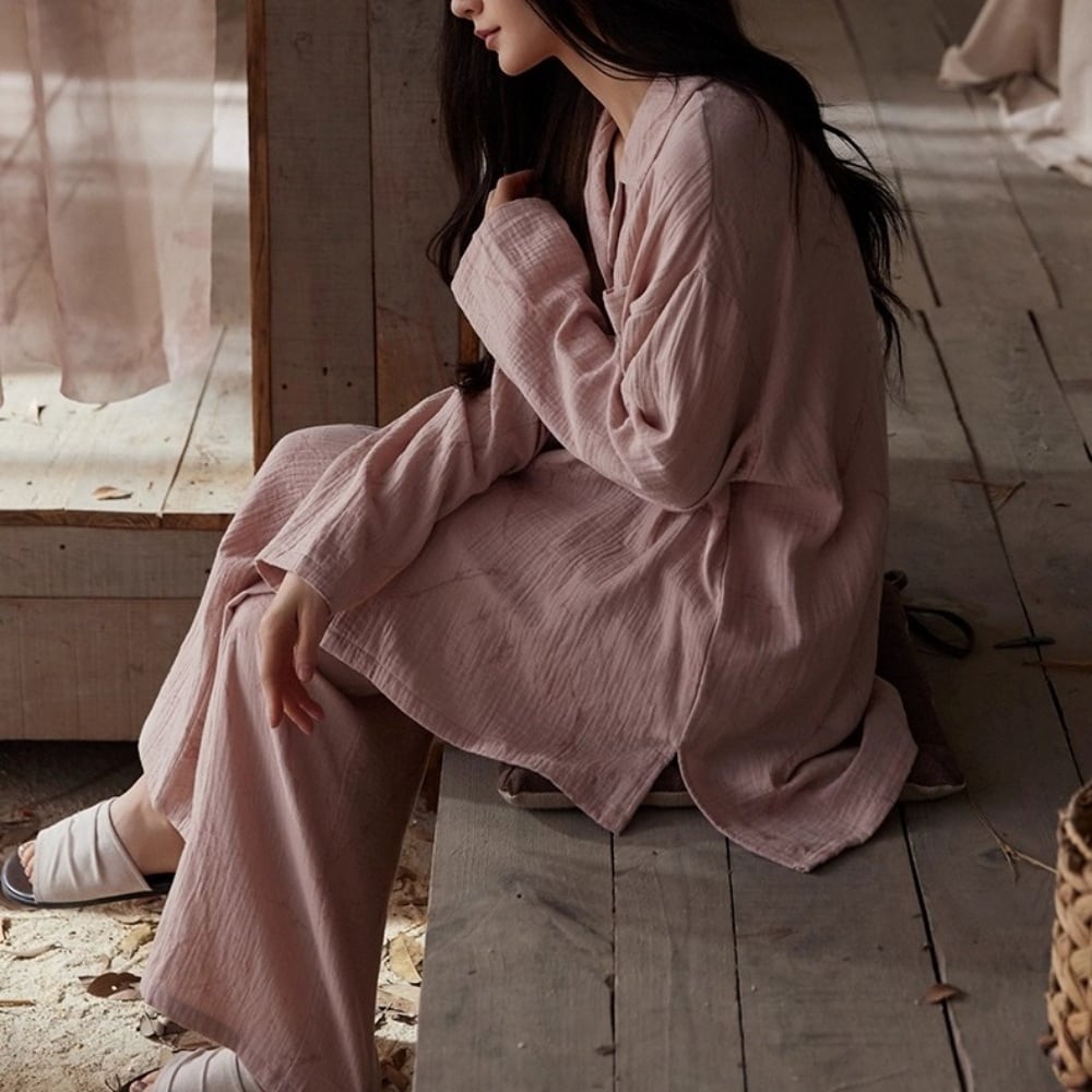 羽織り感覚で着られるフロントボタン仕様は、おうち時間を快適にするだけでなく、急な来客やお泊まりのシーンでも自然と洗練された印象に。