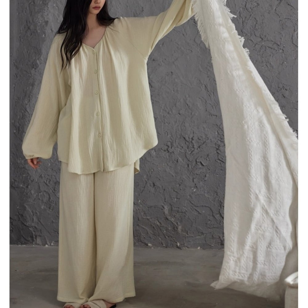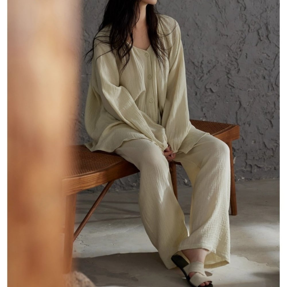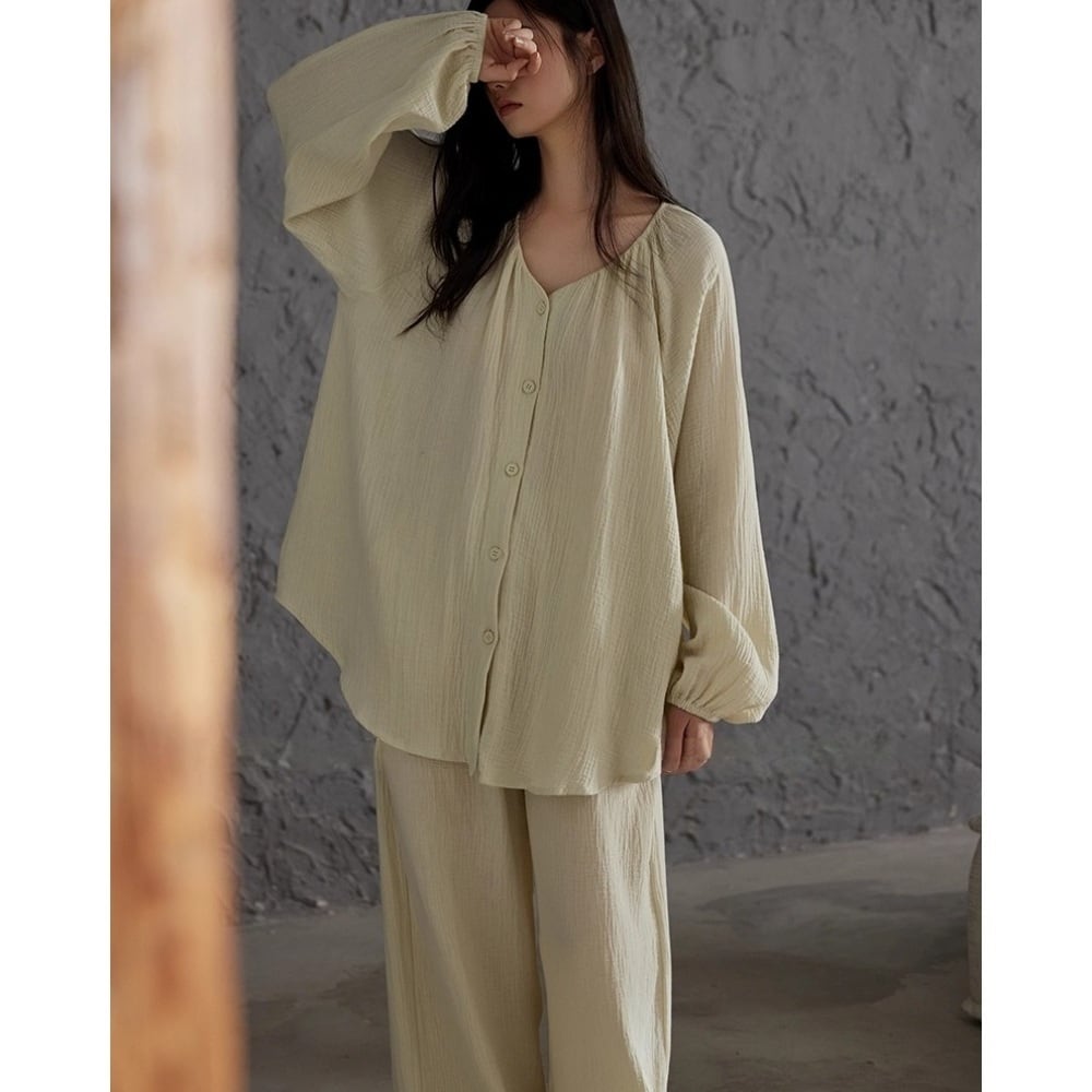 【2type】【M-2XL】over size v-neck cardigan style pajamas p1515 やわらかなライトベージュが気分を明るくするパジャマSET。 ゆったりとしたシルエットとVネックで、くつろぎの時間も動きやすく、肩の力を抜いたまま過ごせます。 軽やかな素材でそのままラフに羽織るだけでもさまになり、おうち時間やお泊まりにもぴったり。 おうち時間もお気に入りの自分で。 【size】 M:着丈68cm | 胸囲112cm | 袖丈66cm | ズボン丈95cm | ウエスト58cm | ヒップ110cm L:着丈70cm | 胸囲116cm | 袖丈68cm | ズボン丈97cm | ウエスト60cm | ヒップ114cm XL:着丈72cm | 胸囲120cm | 袖丈70cm | ズボン丈99cm | ウエスト62cm | ヒップ118cm 2XL:着丈74cm | 胸囲124cm | 袖丈72cm | ズボン丈101cm | ウエスト64cm | ヒップ122cm 【素材】 綿100% ▪︎SUYAA人気ランキングbest10 https://www.suyaa.shop/blog/2021/11/14/025758 ▪︎SUYAAロングセラー人気アイテムはこちら https://www.suyaa.shop/categories/3901376 ▪︎SUYAA shop トップページ https://www.suyaa.shop/ ▪︎ご購入前にこちらを必ずお読みください。 後払い決済についても記載しております。 https://www.suyaa.shop/blog/2021/07/11/002334 ーーーーーーーーーーーーーーーーーーーーーーーー おまとめ購入におすすめ!大好評! 【SILK inner wear】 ルームウェア、パジャマのインナーにおすすめなシルク素材のアイテムを多数取り扱っております ❁silk❁ シルクは保温性、吸湿性、放湿性に優れていて 静電気が起きにくいのでお肌にも体にも優しい素材です 日常に身につけるインナー類はシルク素材のものを使用し、静電気の影響を防ぐことで体にかかるストレスを減らすことにもなり、健康(冷えや血流)や美容や睡眠の質の改善、予防にも役立ちます。 お肌に一番近いところに身に着けるインナー類、女性にとって大切な胸や陰部を守るために身につける下着はぜひシルクが含まれる素材のインナーをおすすめです。 SUYAAではお手頃価格でデザイン性も重視したシルクインナーを取り揃えております! ルームウェアやパジャマと共にぜひご利用ください。 ▪︎シルク素材インナー (ブラジャー/ショーツ/キャミソール/ 高品質silkパジャマetc...)はこちら ↓ https://www.suyaa.shop/categories/3616774 ーーーーーーーーーーーーーーーー 【ご挨拶】 沢山のショップの中からSUYAAをご覧いただきまして有難うございます。 SUYAAは海外からお取り寄せしたルームウエアを取り扱うルームウェア専門ショップです。 オーナーの私が重い睡眠障害/不眠症に悩んだ経験があり そこから眠りの大切さを知りその経験から 皆様の眠りやおうち時間を少しでも心地よく過ごしていただけるように、との想いでSUYAAを立ち上げました。 海外からのお取り寄せ商品となると、 本当に届くのか?商品は大丈夫なのか?など、 不安に感じられるお客様もいらっしゃると思います。 当店は信頼のあるルームウェア専門のお店から買い付けをしております。 海外からのお取り寄せのため、お届けまでにお時間をいただきますが最後までしっかりと対応させていただくことをお約束します。 今までご購入していただいた多数の商品の中で、発送後届かなかった。という事は一度もございません。 有難いことにSUYAAのルームウエアを気に入っていただき再購入してくださる方も多くいらっしゃいます。 本当に届くのか?とご心配な方にも安心していただけるために【後払い決済】もご用意しております。 (後払い決済の詳細は下記のURLをご覧ください) ご購入、ご入金、発注とタイムラグがあるため、 ご購入後に売り切れのご連絡をさせていただく可能性 もございますが、その際はその他の商品へのご変更、 もしくは返金対応をさせていただきます。 皆様の大切なお時間や資金を頂いて、購入していただいた想いを大切に最後まで責任を持って対応させていただく所存です。どうぞよろしくお願い致します。 ▪︎Instagram InstagramアカウントではSALE情報や新作情報なども随時掲載しております。 ▪︎公式Instagram @suyaa_sleep https://www.instagram.com/suyaa_sleep ▪︎公式LINEお友達登録で500円OFFクーポン ➕眠りと自律神経整えnoteプレゼント ↓↓↓ https://lin.ee/lUQPAtU