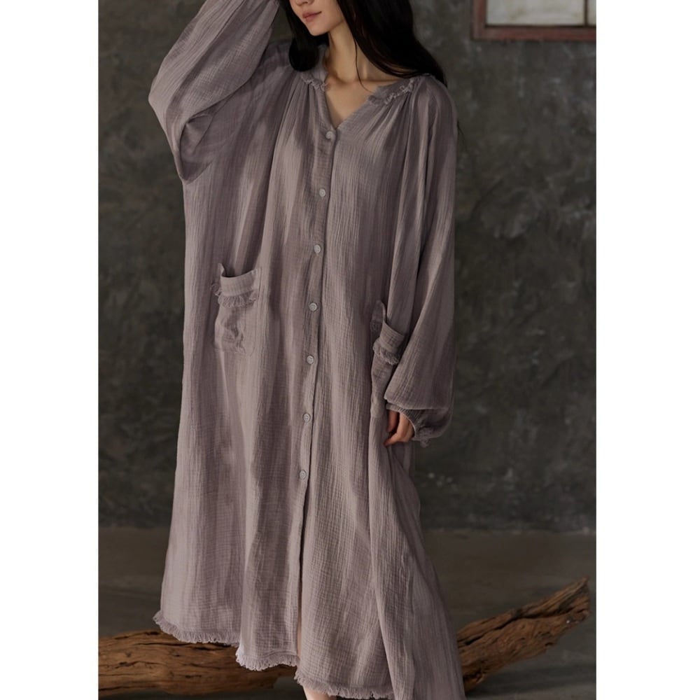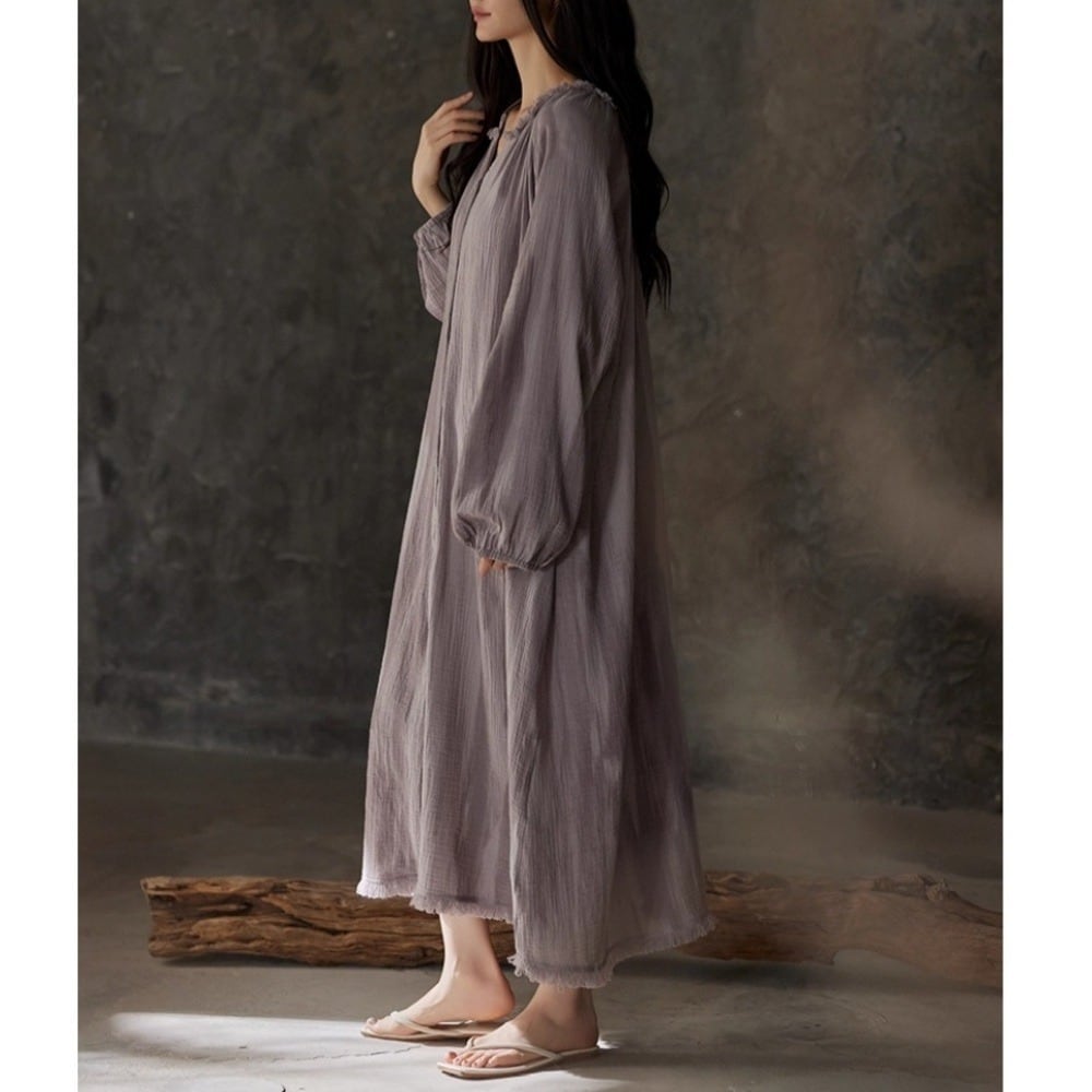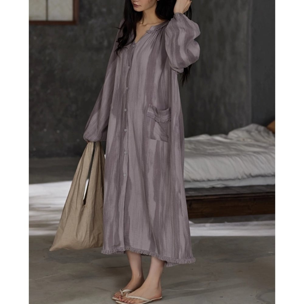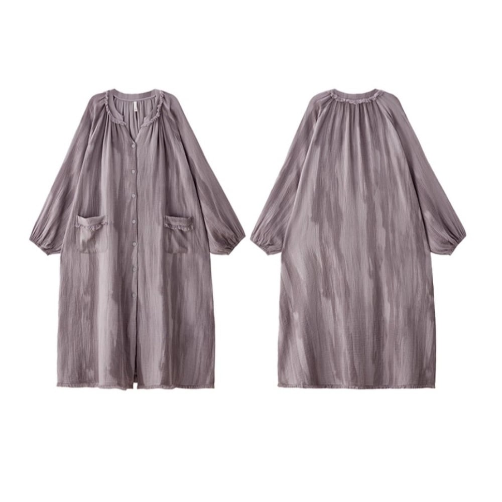 くすみパープルが、ほんのり可愛らしいロング丈のルームウェア。