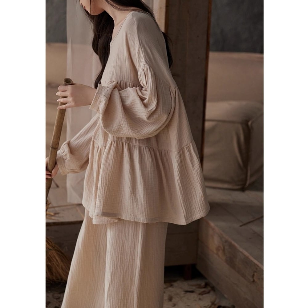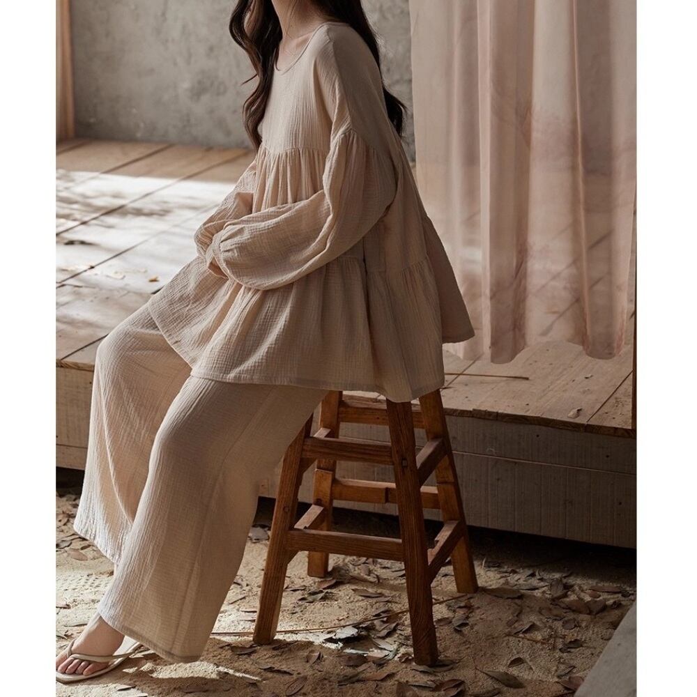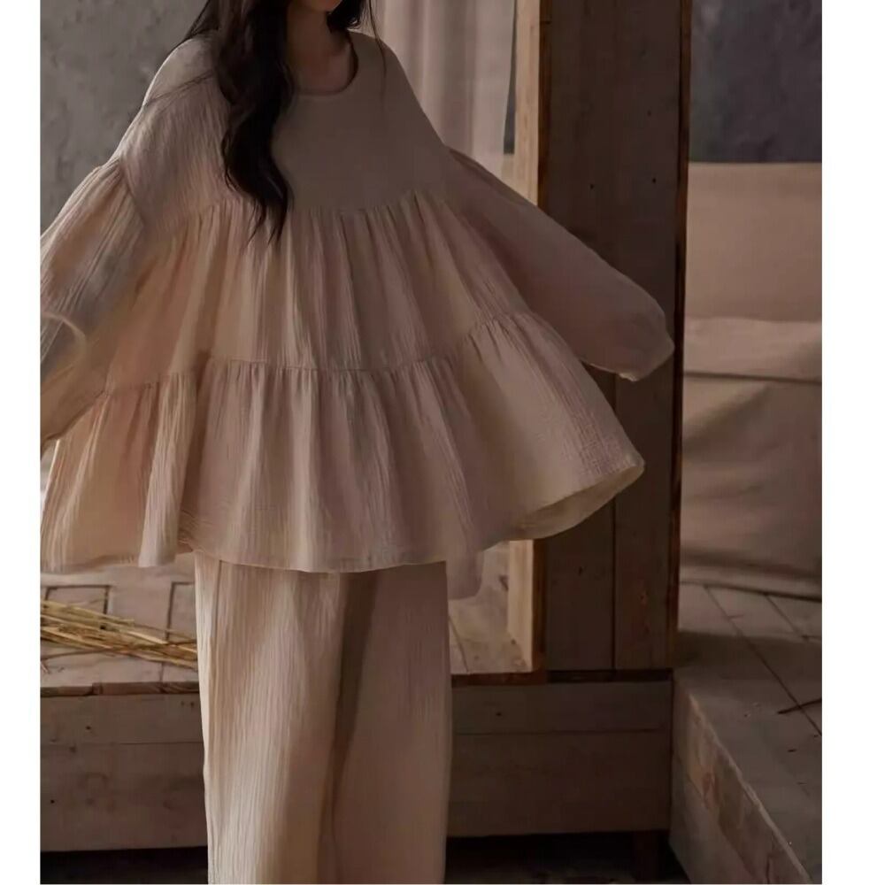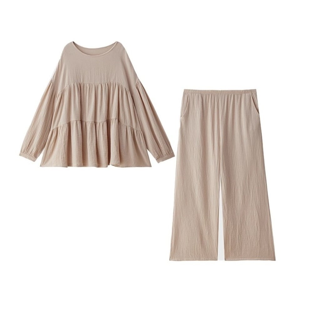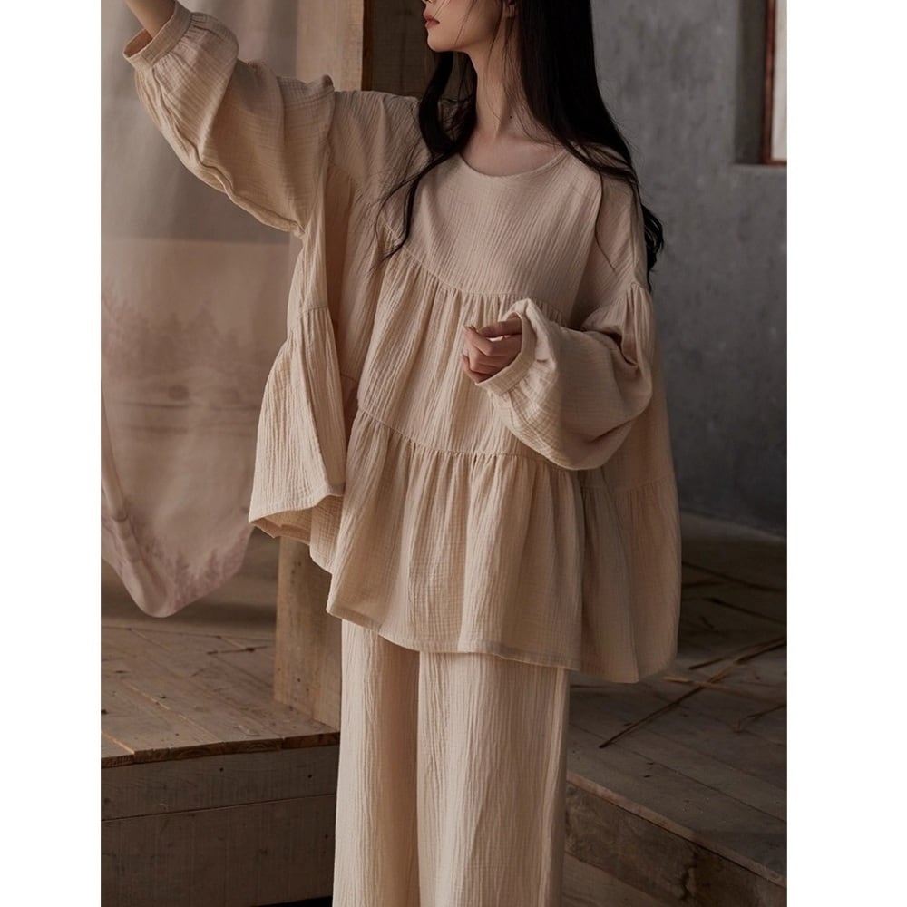 ふんわりと広がるティアードシルエットが魅力のルームウェア。