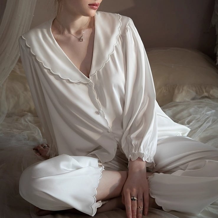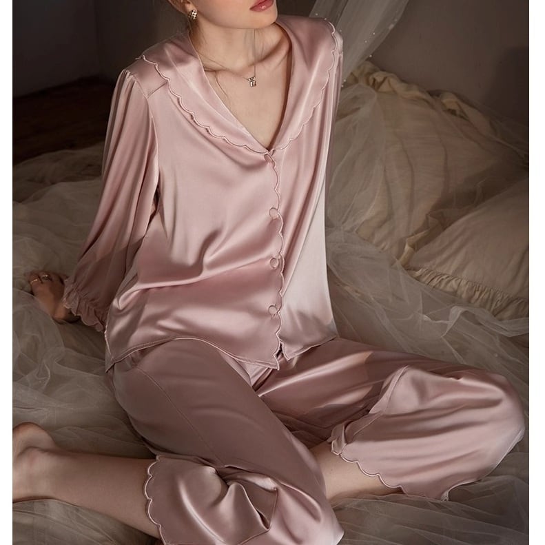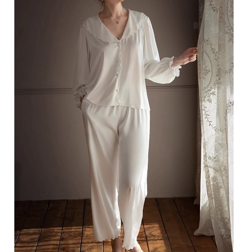 とろみのある素材が女性らしいシルエットを美しく引き立てるルームウェアです。