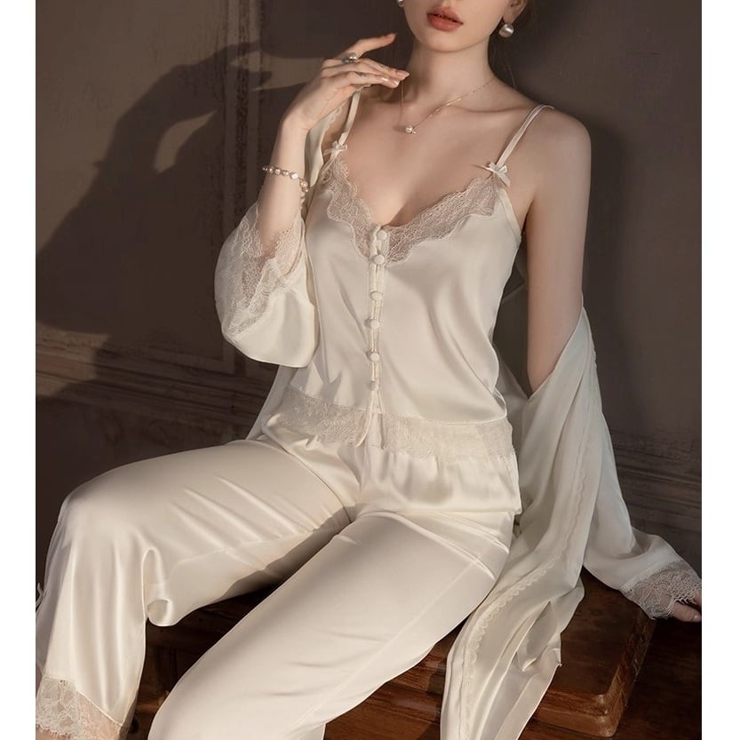 繊細なレースデザインと上品な光沢感が魅力の、キャミソール・カーディガン・パンツの3点セットパジャマ。