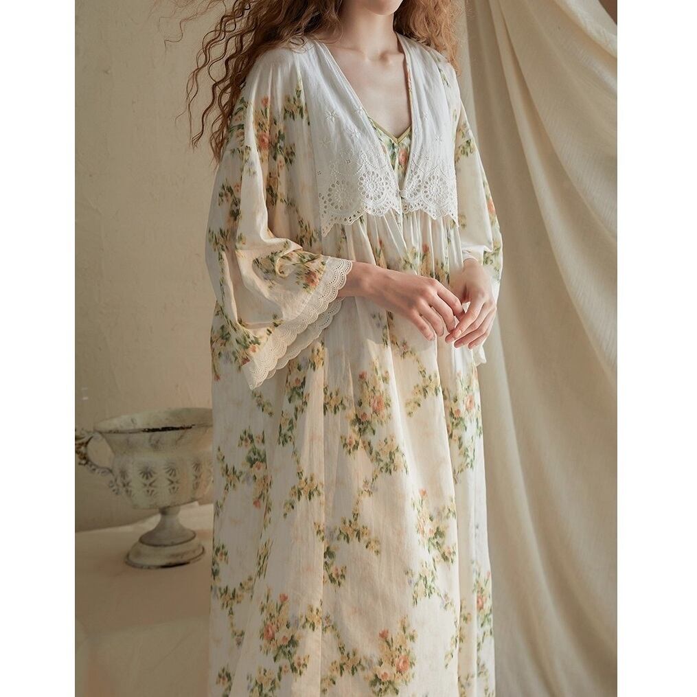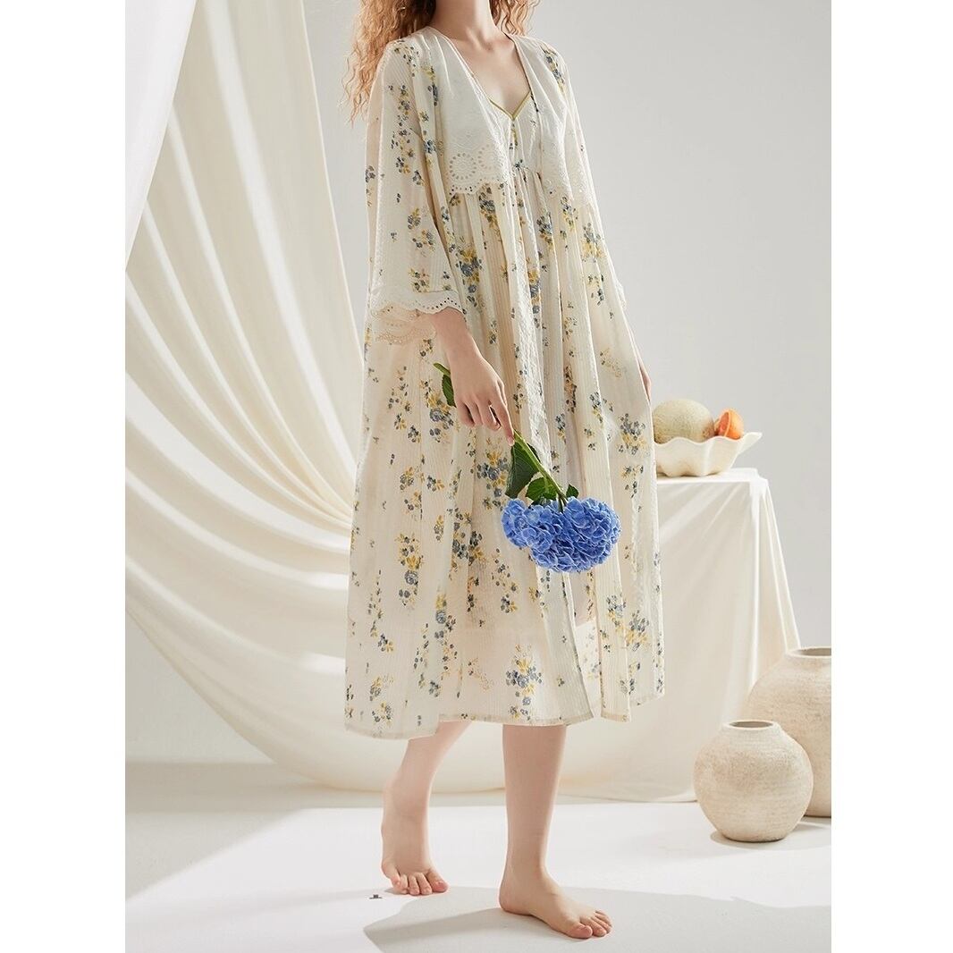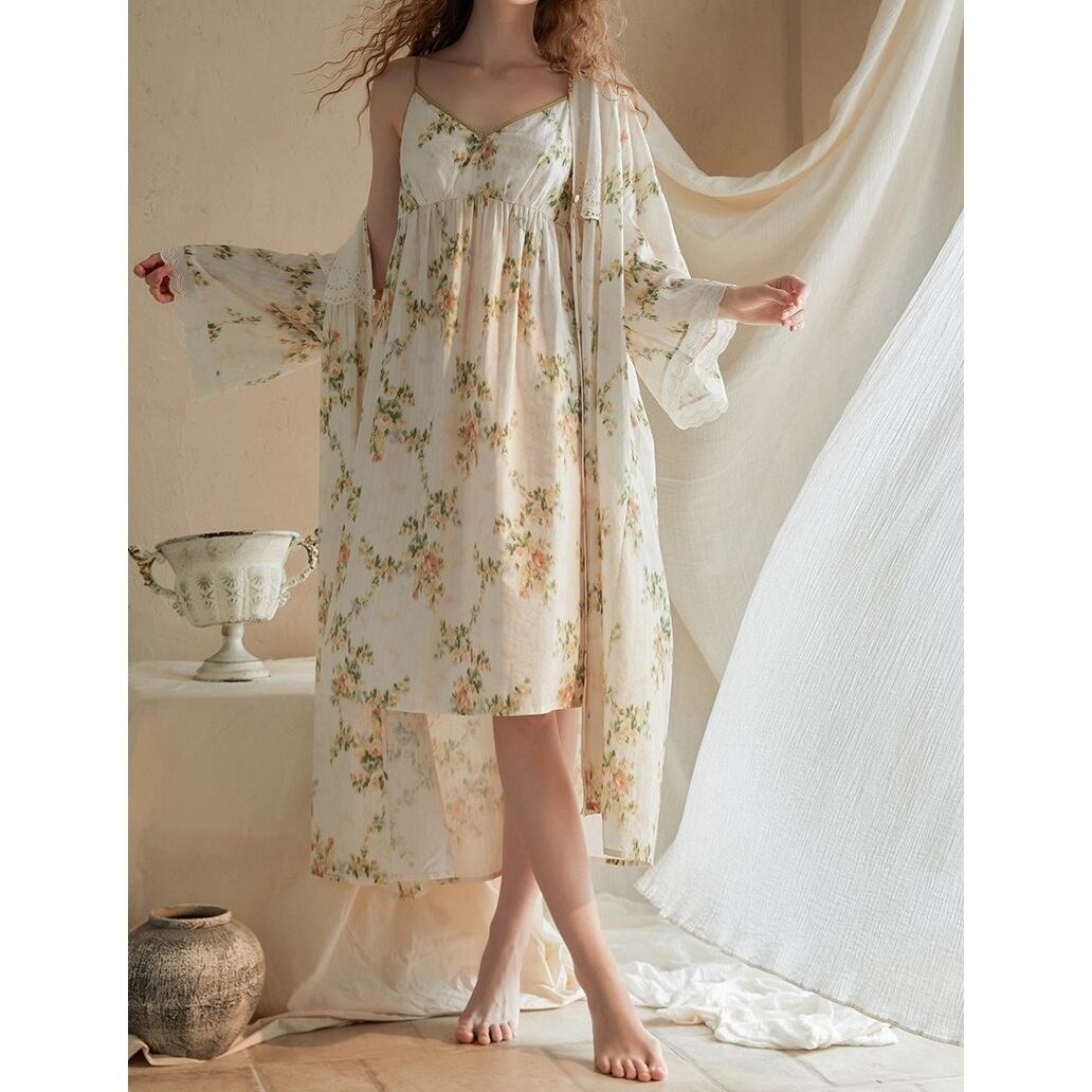 繊細な花柄ガウンに、やわらかなキャミソールドレスを重ねたルームウェアセット。