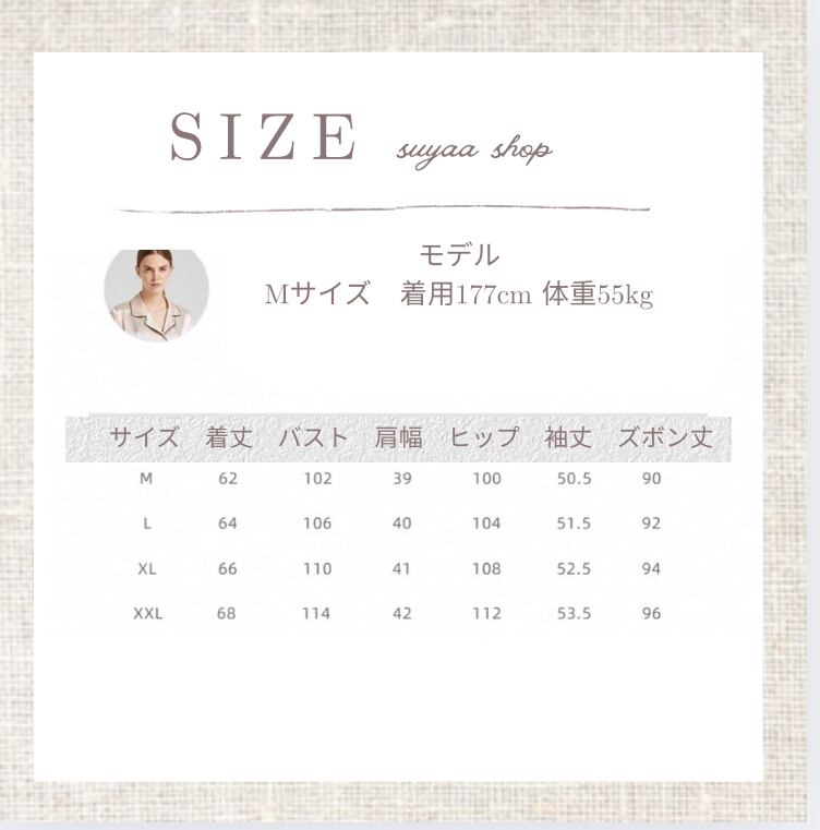 SUYAA人気ランキングbest10 ↓ https://www.suyaa.shop/blog/2021/11/14/025758 ▪︎SUYAA人気アイテムはこちら https://www.suyaa.shop/categories/3901376 ▪︎公式Instagram https://www.instagram.com/suyaa_sleep ▪︎SUYAA shop https://www.suyaa.shop/ ❁.。.:*:.。.✽.。.:*:.。.❁.。.:*:.。.✽.。.:*:.。.❁.。 【必ずお読みください】 こちらのパジャマはシルク100%となっております。22匁のシルクでできた上質なパジャマです。 シルクの素材の特性上、どうしてもシワになりやすく、アイロン掛けをして発送しておりますが どうしてもシワになってしまいますので割引価格にてご提供させていただいております。 ご理解の上ご注文よろしくお願いします。 手触り肌触りもとても滑らかで心地よい素材となっております。 シルクは保温性、吸湿性、放湿性に優れていて お肌の成分に近い約20種のアミノ酸が結合した純粋なタンパク質繊維でできているのでお肌にもやさしく、 静電気が起きにくいので体にもやさしい素材です! 静電気が起きにくい=睡眠の質も上がります。 静電気が起きやすい衣類を日常的に着用していると 帯電しやすく体はストレスを感じ、不調や冷えなどが起こりやすくなります。 とくに睡眠時は寝返りを沢山打つことで静電気が沢山発生してしまいます。静電気が沢山発生すると脳はストレスを感じて、睡眠の質にも影響を及ぼしてしまいます。 そのため、睡眠時にはシルクや綿素材のアイテムで 静電気対策をすることで睡眠の質を高めることが おすすめです! ◎シルク枕カバー https://www.suyaa.shop/items/58691216 ▪︎睡眠時に髪の毛のケアもしたい方にはシルクのヘアキャップもございます。 (睡眠時は寝返りの摩擦や静電気で髪の毛が傷みやすくなるのでモデルさんはヘアキャップを着用されている方が多いです) ◎シルク100%ヘアキャップ https://www.suyaa.shop/items/58685348 【素材】シルク80%ポリエステル20% ーーーーーーーーーーーーーー 【SILK素材インナーウェア】 ❁silk❁ シルクは保温性、吸湿性、放湿性に優れていて お肌の成分に近い約20種のアミノ酸が結合した純粋なタンパク質繊維でできているのでお肌にもやさしく、 静電気が起きにくいので体にもやさしい素材です 日常に身につけるインナー類はシルク素材のものを使用し、静電気の影響を防ぐことで体にかかるストレスを減らすことにもなり、健康や美容や睡眠の質の改善にも役立ちます! 肌に一番近いところ、女性にとって大切な胸や陰部を守るために身につける下着はぜひシルクが含まれる素材のインナーをおすすめしています! SUYAAではお手頃価格でデザイン性も重視したシルクインナーを取り揃えております!ルームウェアやパジャマと共にぜひご利用ください。 シルク素材インナーはこちら (ブラジャー/ショーツ/キャミソールetc...) ↓ https://www.suyaa.shop/categories/3616774 シルク商品の中にはシルク以外を使用しているデザインもございます。シルク100%でお肌が弱い方におすすめ商品はこちらです ↓ https://www.suyaa.shop/categories/4017780 silk アイテム人気ランキング ↓ https://www.suyaa.shop/blog/2021/12/14/131423 ーーーーーーーーーーーーーーーー 【お届けについて】 こちらの商品は海外店舗より直接発送となる為、 ご入金から早くて10日〜3週間前後でお届け致します。(時期や商品によって30日ほどいただく場合もございます) ◼️注意事項 ・タイミングによっては 商品在庫切れにより 注文キャンセルとさせていただく恐れもございますので、予めご了承くださいませ。 その場合は最後までしっかりと対応させていただきますのでご安心ください。 ————————————ーーーー ご購入前にこちらを必ずお読みください。 ↓ https://www.suyaa.shop/blog/2021/07/11/002334 商品番号S001