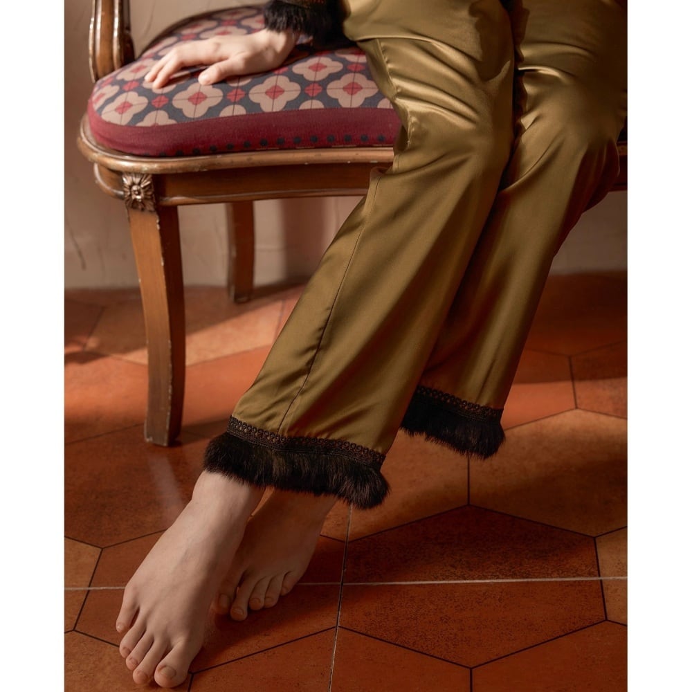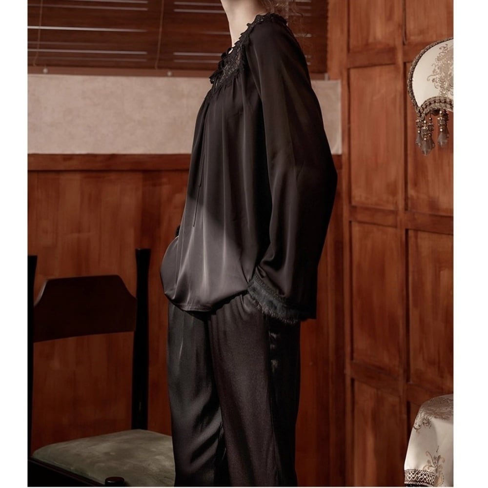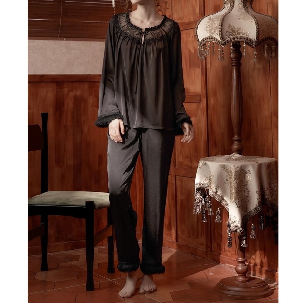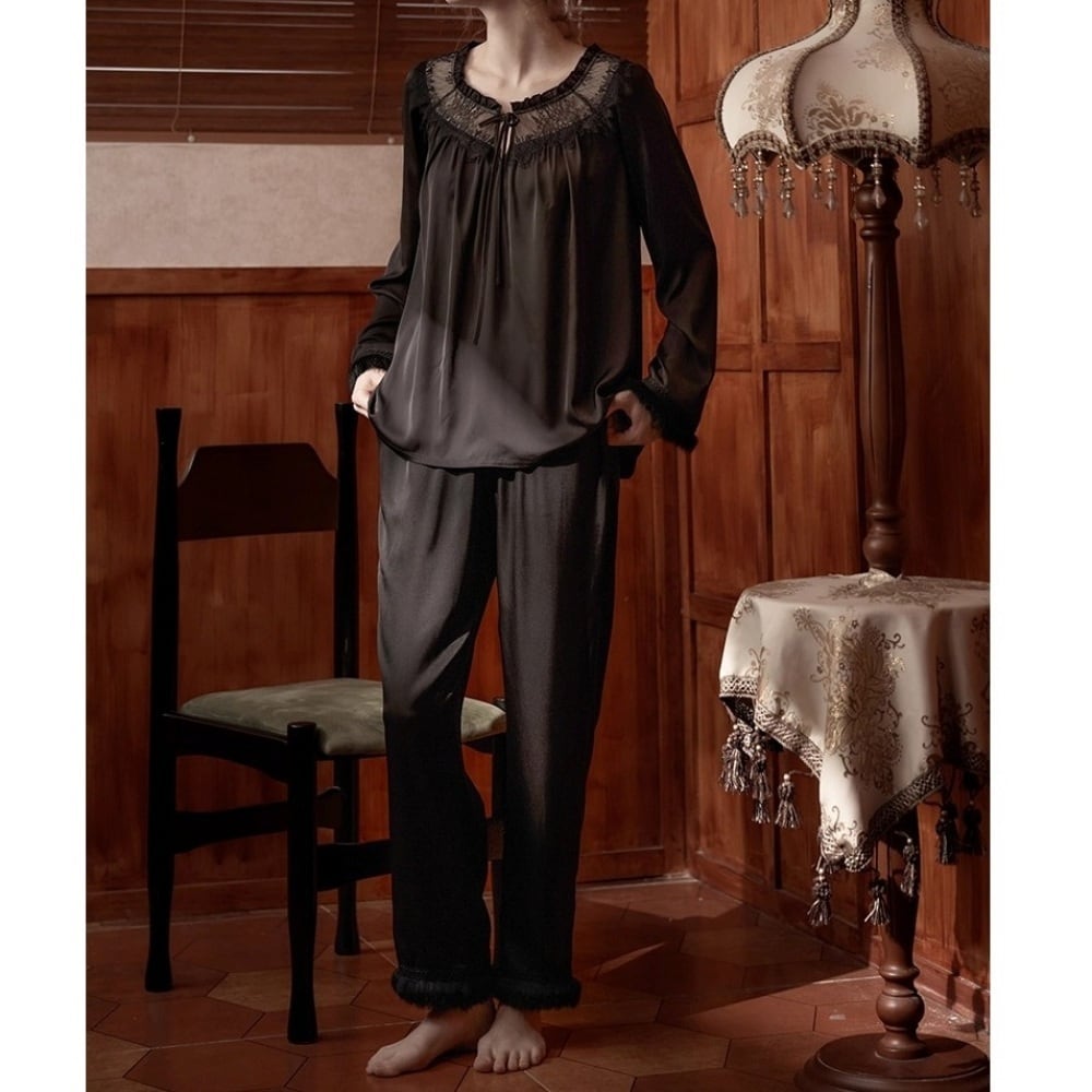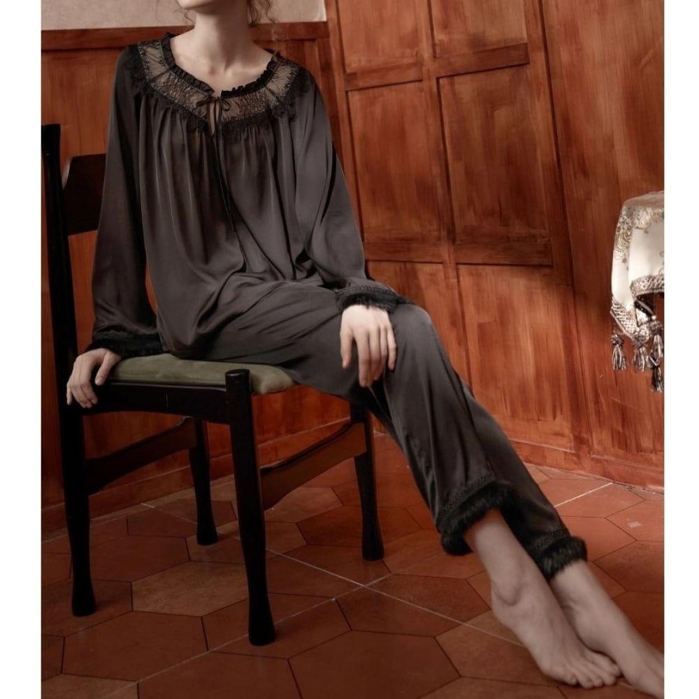 しっとりと光をまとった生地に、繊細なレースをあしらったエレガントなパジャマSET。