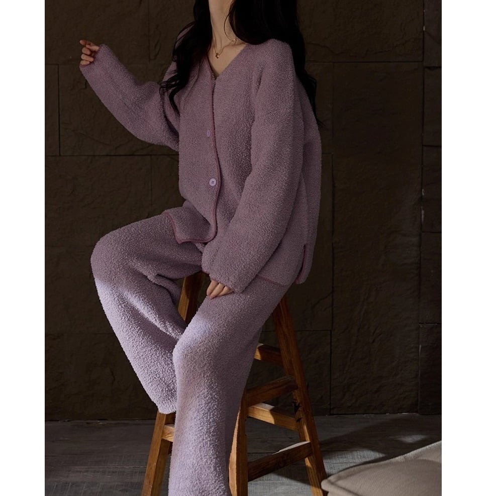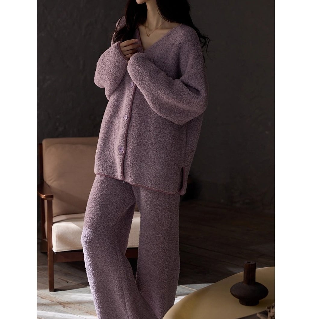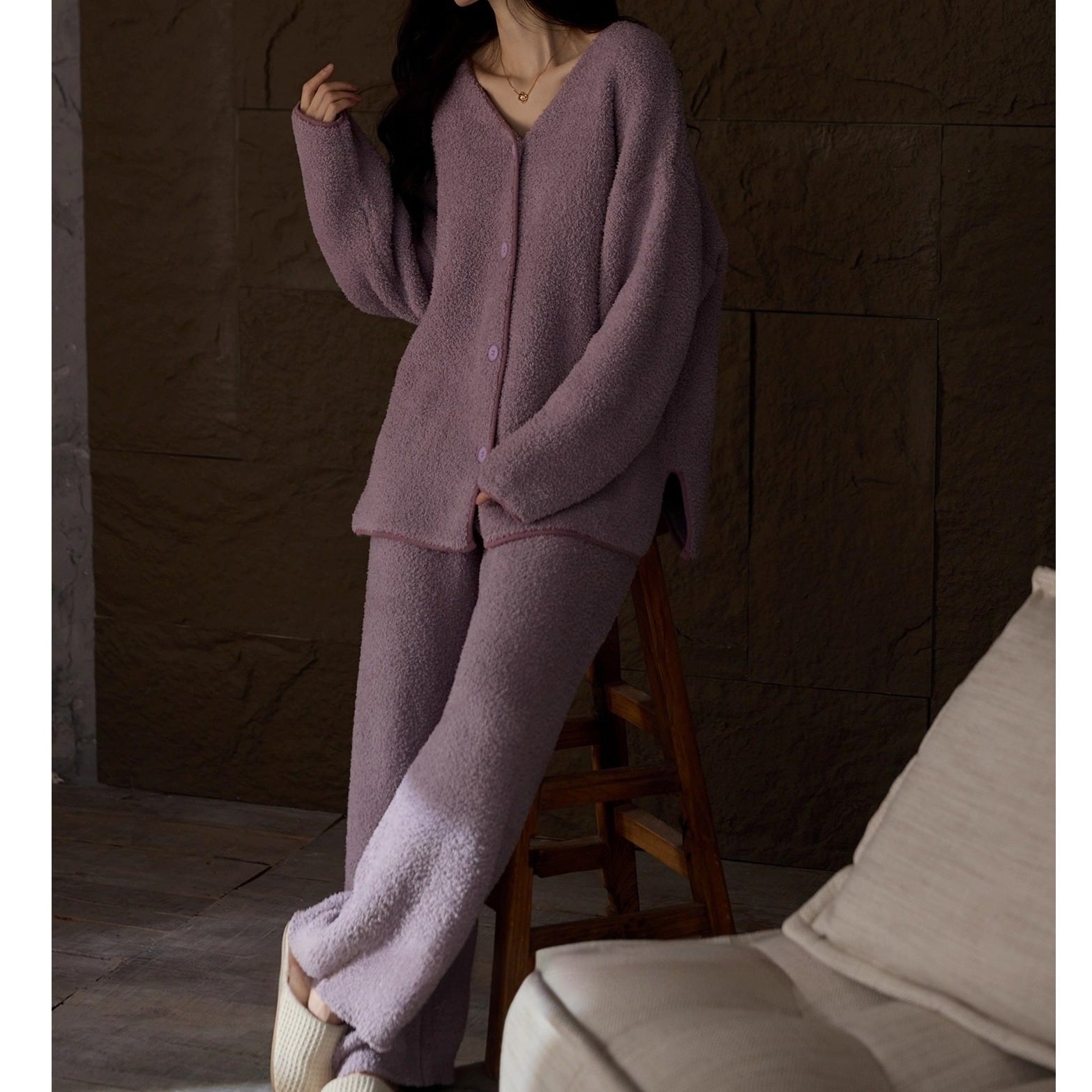 訳ありSALE 【M-XL】fleece v-neck cardigan style simple pajamas p1573