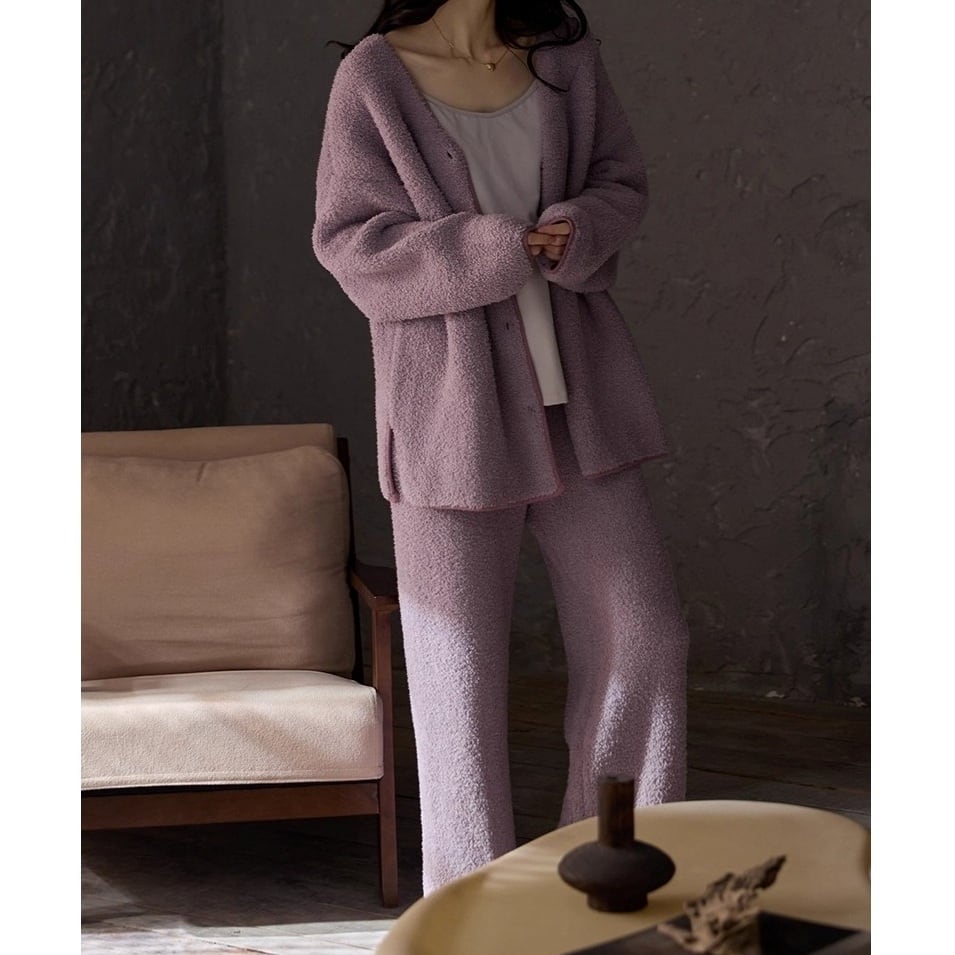 Vネックのクリーンなラインが顔まわりをすっきり見せ、カーディガンのように軽く羽織れるデザインで、リラックスタイムをストレスなく楽しめます。