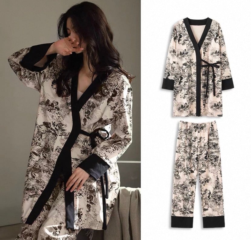 【M-2XL】 2piece monotone flower pattern cardigan style tops+inner+pants pajamas p1588