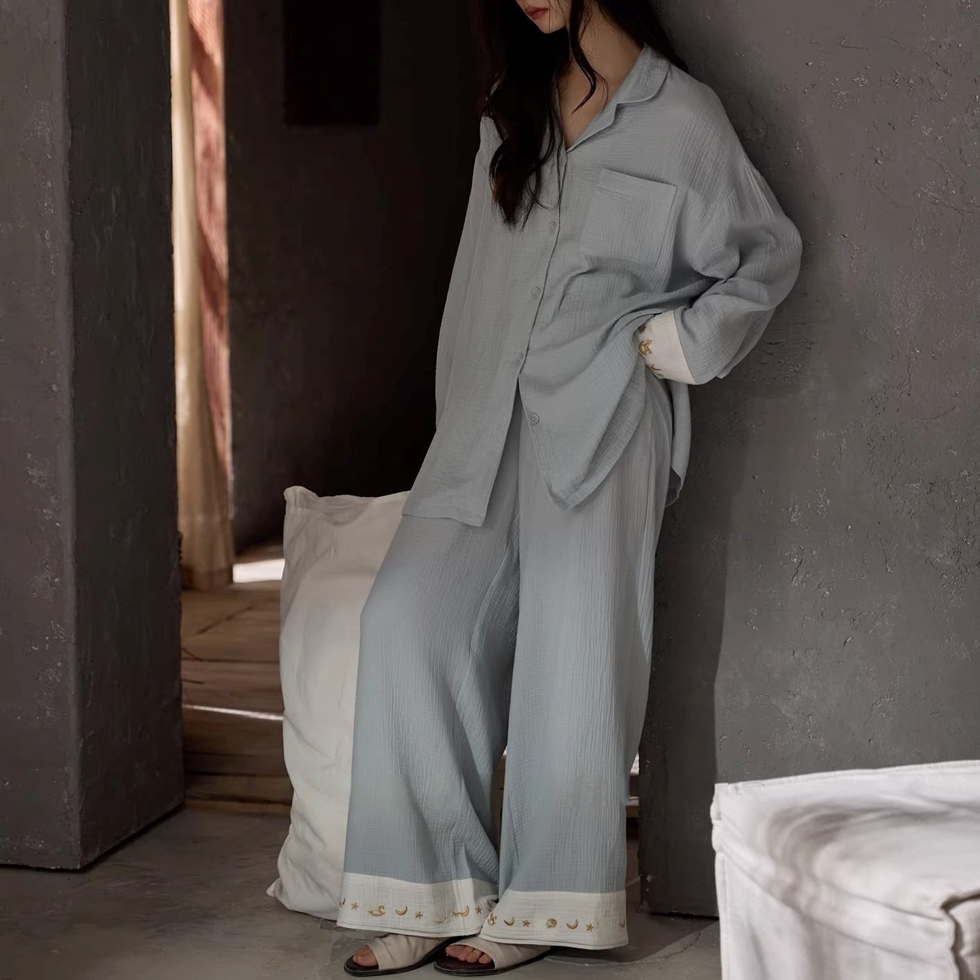 袖口とズボン裾には、ゴールド系の星や月の刺繍をさりげなくプラス。