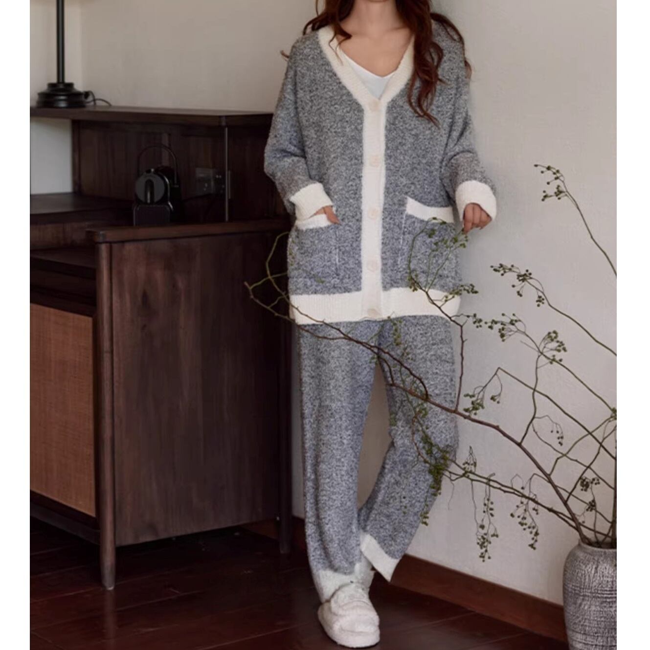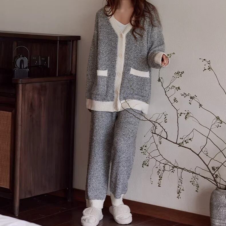 【M-XL】warm two-tone v-neck cardigan style pajamas p1618