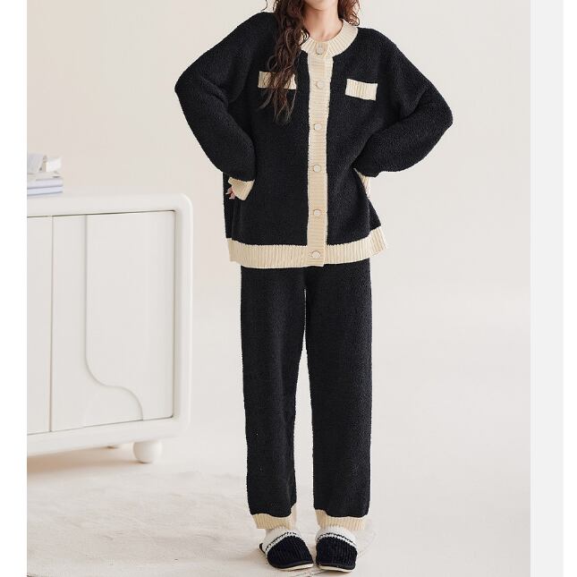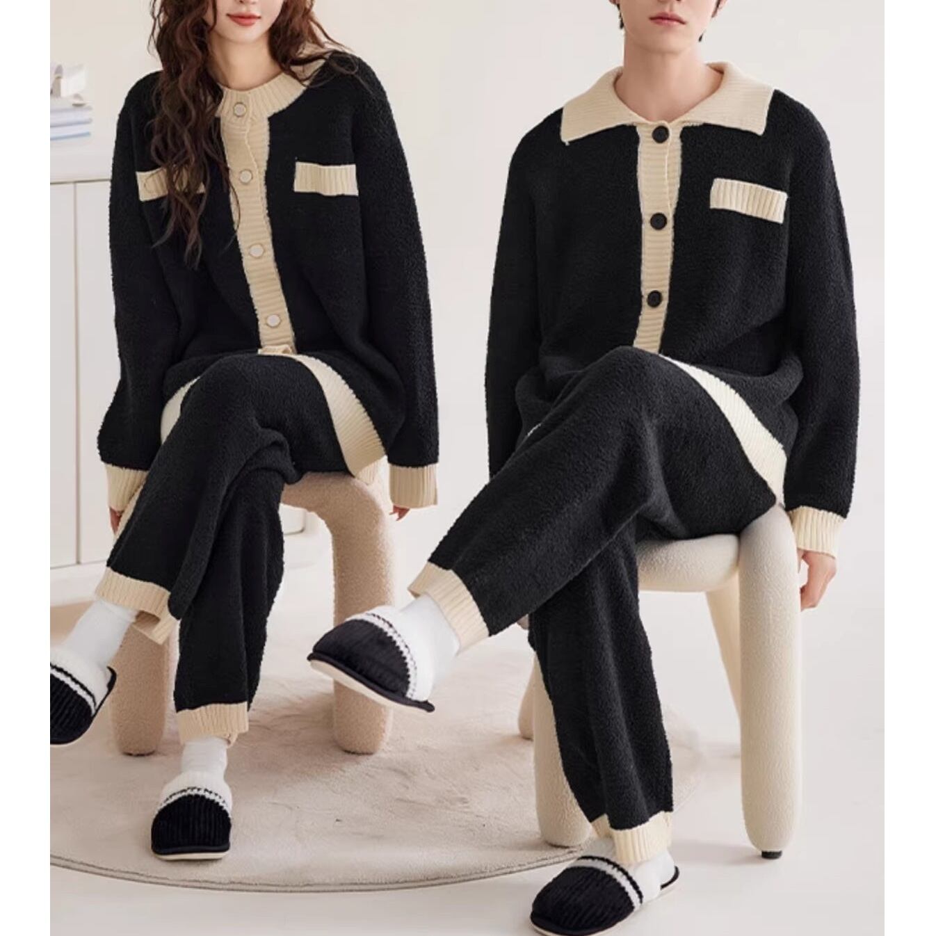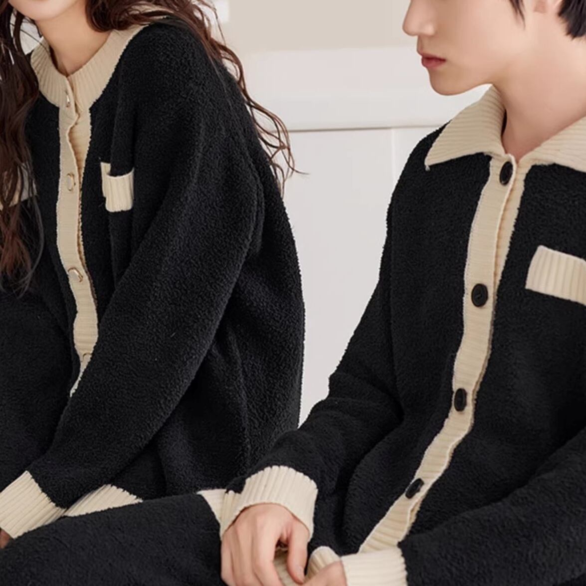 【Men's/Ladies】warm bicolor monotone cardigan style pair pajamas p1622