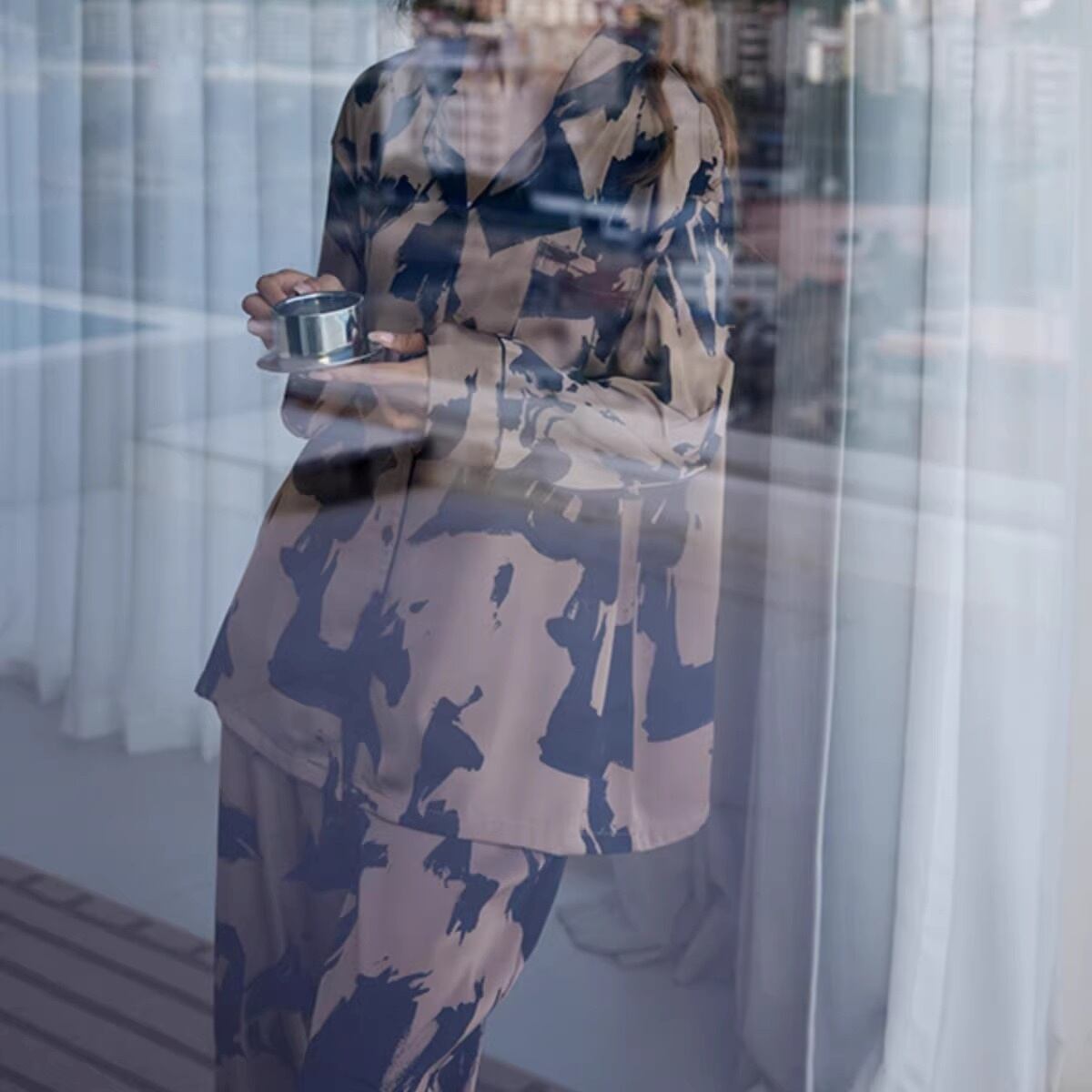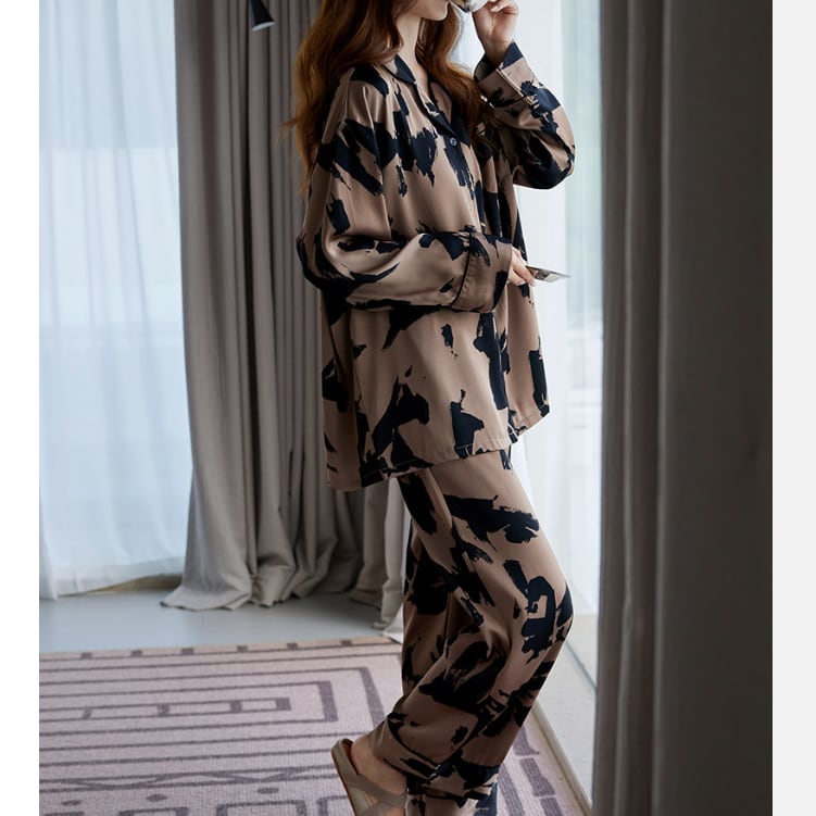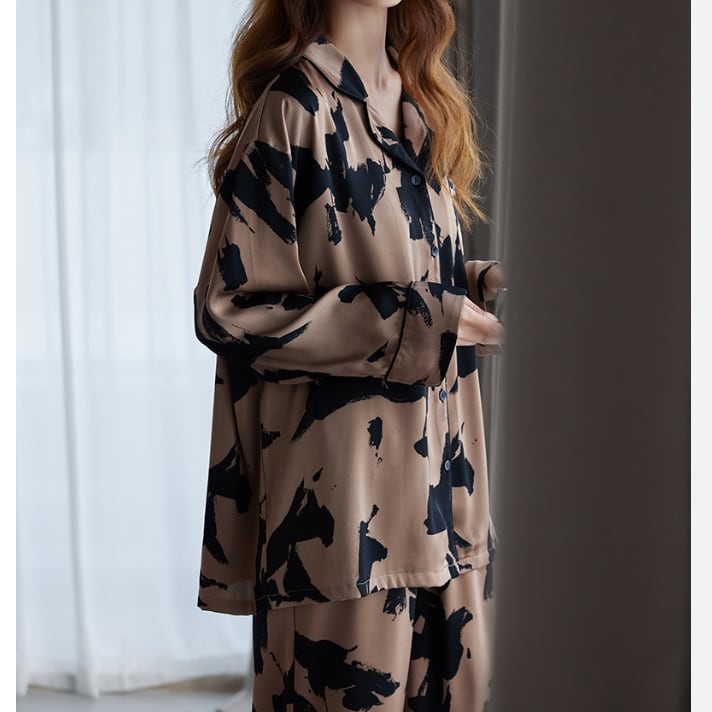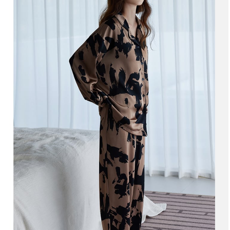 ブラウンをベースにブラックのプリントをあしらった、シックな印象のパジャマSET。