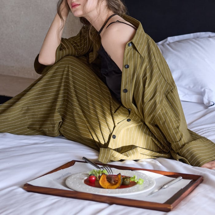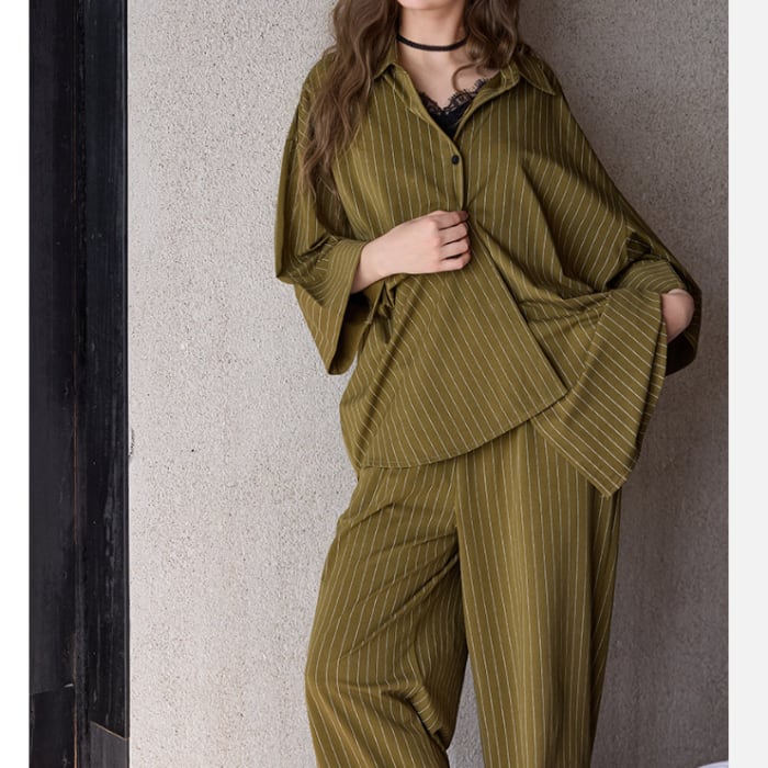 オリーブグリーンを基調にしたストライプ柄のパジャマSET。