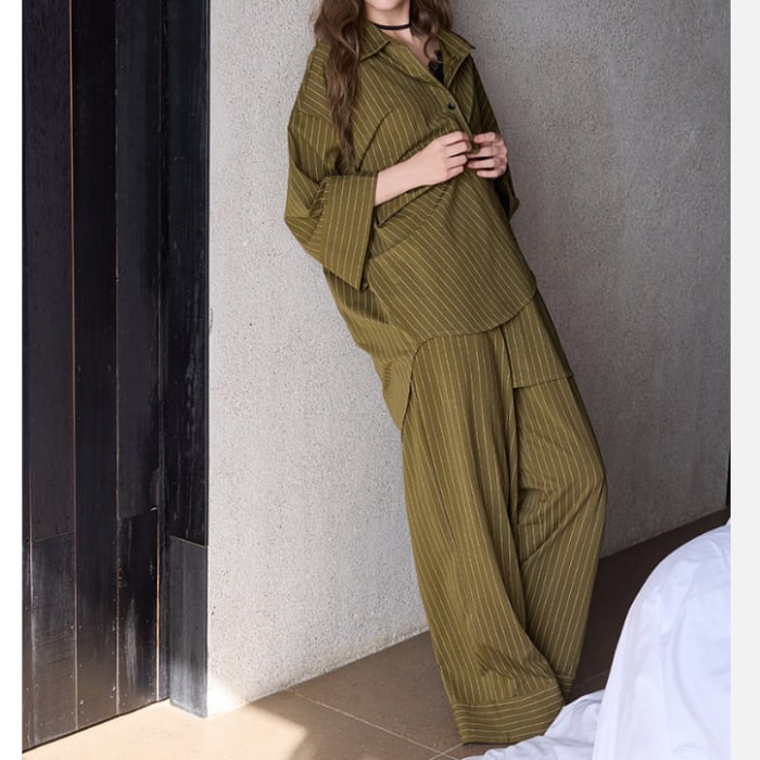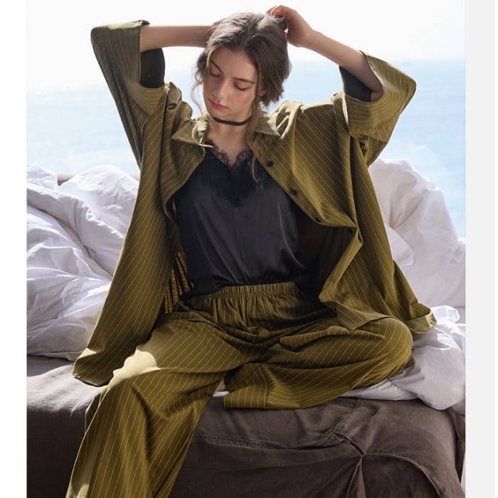 【M-XL】stripe pattern olive green cardigan style pajamas p1628