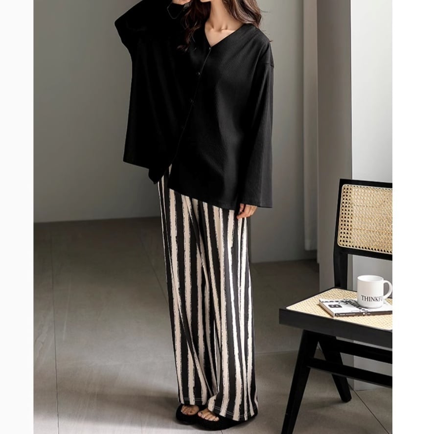 クールで抜け感のあるルックスが魅力の、黒トップス+ストライプ柄パンツSET。
