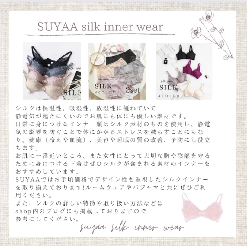 SUYAAではお手頃価格でデザイン性も重視したシルクインナーを取り揃えております!ルームウェアやパジャマと共にぜひご利用ください。