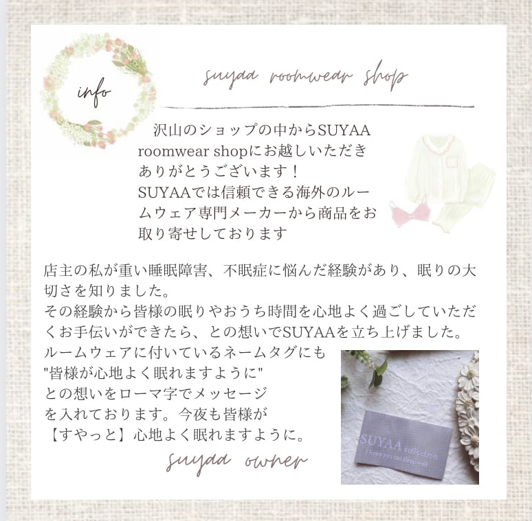 SUYAAは海外からお取り寄せしたルームウエアを取り扱うルームウェア専門ショップです。