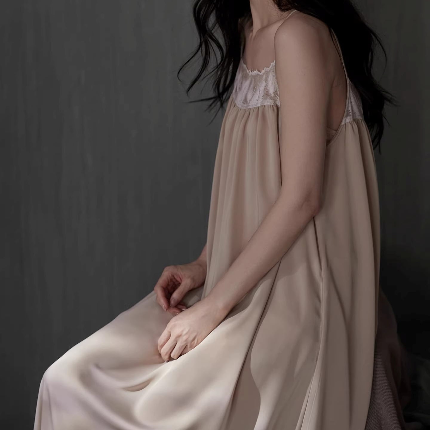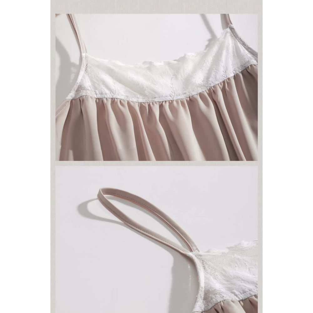 やわらかなベージュカラーに、胸元のレースが上品な華やかさをプラス。