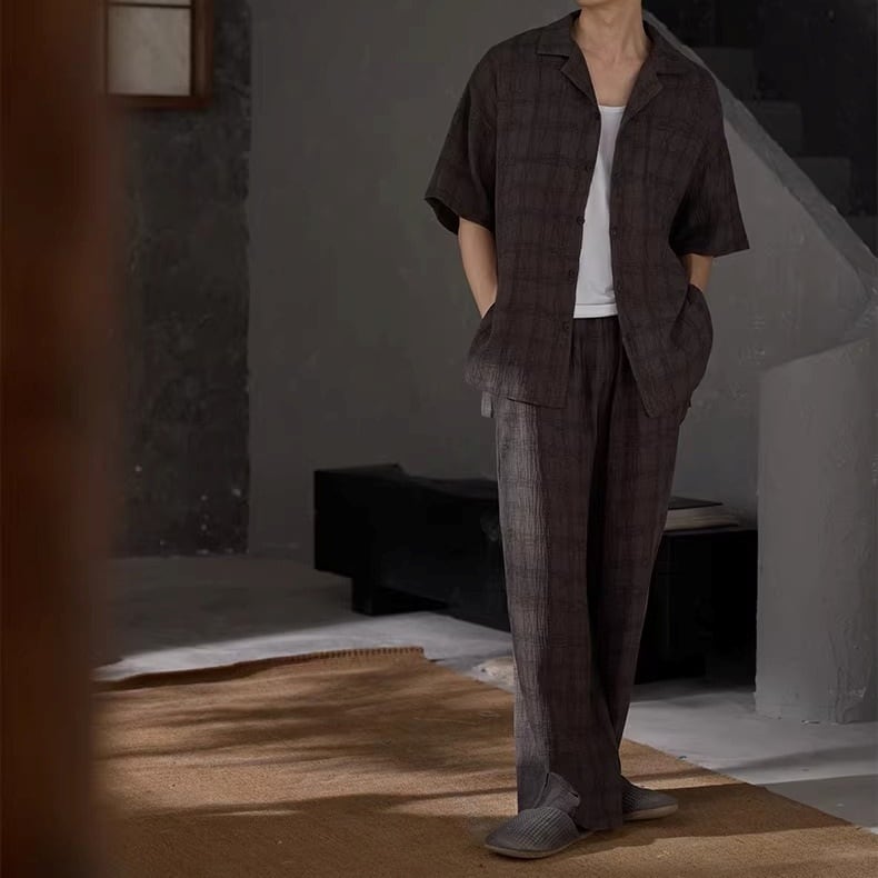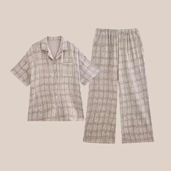 【M-XL】ladies double gauze stripe check pair pajamas p1649