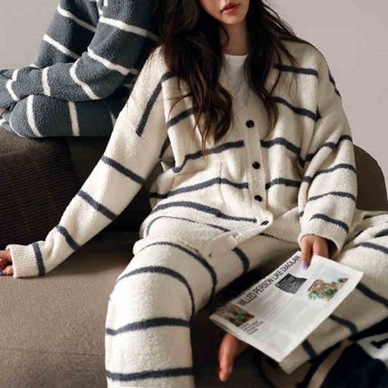 【ladies/M-XL】Cardigan design v-neck stripe pajamas p729